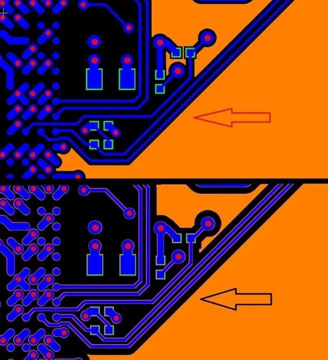一個改進的機會是在銅澆注和相鄰的跡線或焊盤之間使用更大的保留值。 大多數(shù)CAD布局程序將允許您選擇不同于基本電路布線設計規(guī)則的傾注保留值; 我們建議使用此功能非常值得。